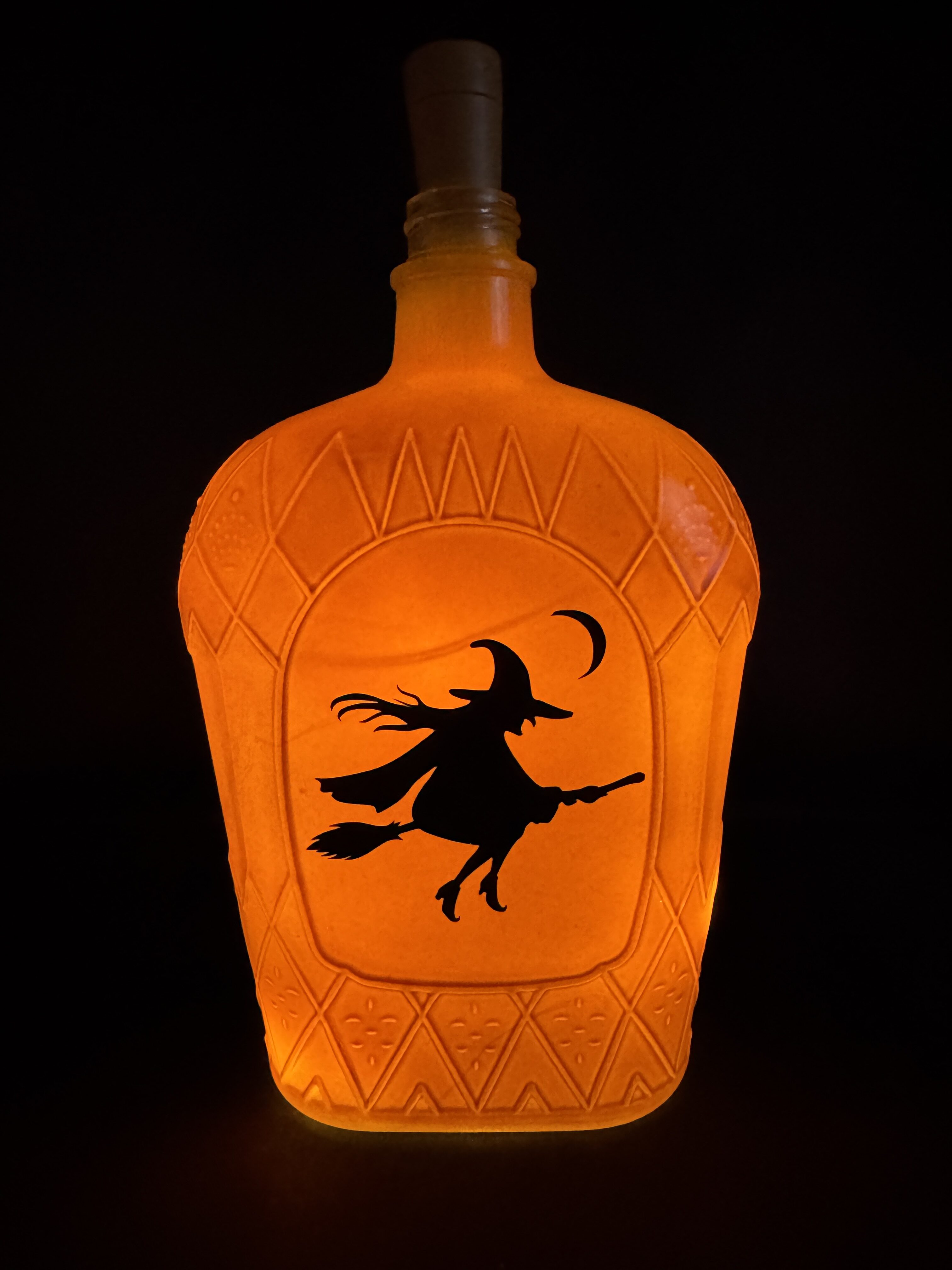 This isn’t just a decoration—it’s a doorway to the unknown, an invitation to embrace the mystical, the eerie, and the magical. Inside the painted glass bottle, a bewitching scene unfolds as a silhouette of a witch, perched on her broom, soars through the glowing mist of eerie, flickering fairy lights. The soft glow dances, creating an atmosphere that is both chilling and captivating, setting the perfect tone for your Halloween celebrations.