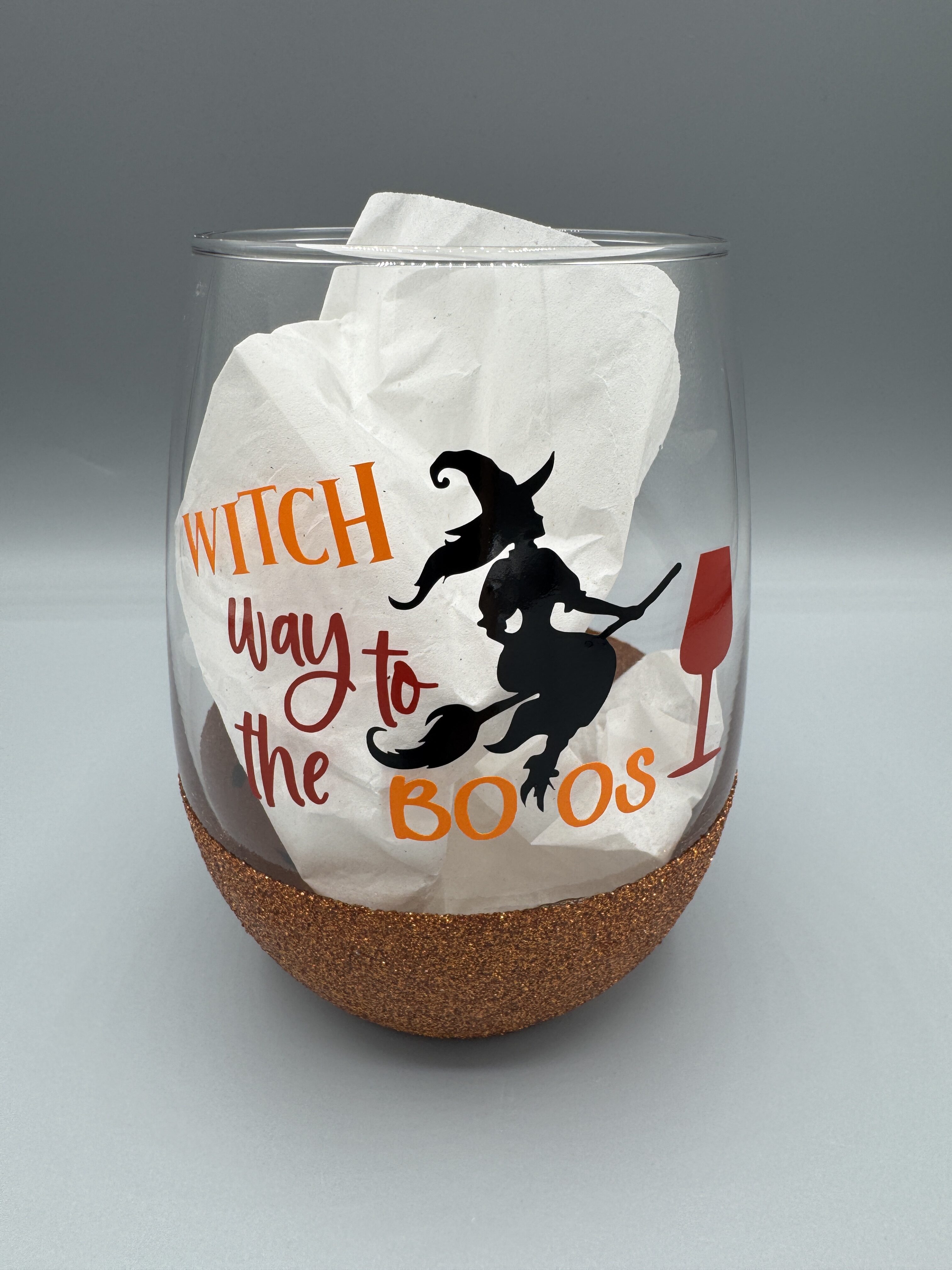 Add some haunted humor to your next sip with our Peek-a-Boo Glass! Featuring the cheeky phrase “Witch Way to the Boos” in playful Halloween script, this glass hides a spooky surprise that appears when you pour your favorite potion — wine, spirits, or maybe just a bubbling brew!